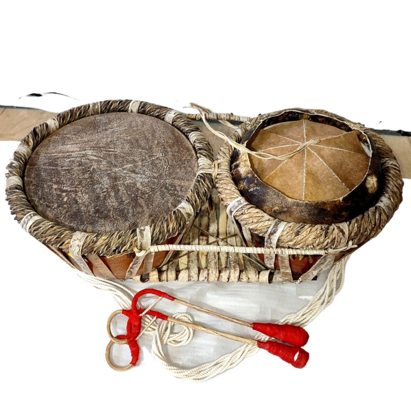 Thammattama, this drum consists of two parts and while the high sounds are produced by the right one, low sounds are produced by the left one. Wood for these drums comes from KOHOMBA, EHELA and JAK trees. The drum is played with two sticks with circular ends and they are made of KADURU. THAMMATTAMA is generally not played with equal pressure. There are special rhythms played on this drum. E.g.: to invite people in to the temple, invite Buddhist priests for Pirith ceremonies or Alms giving.