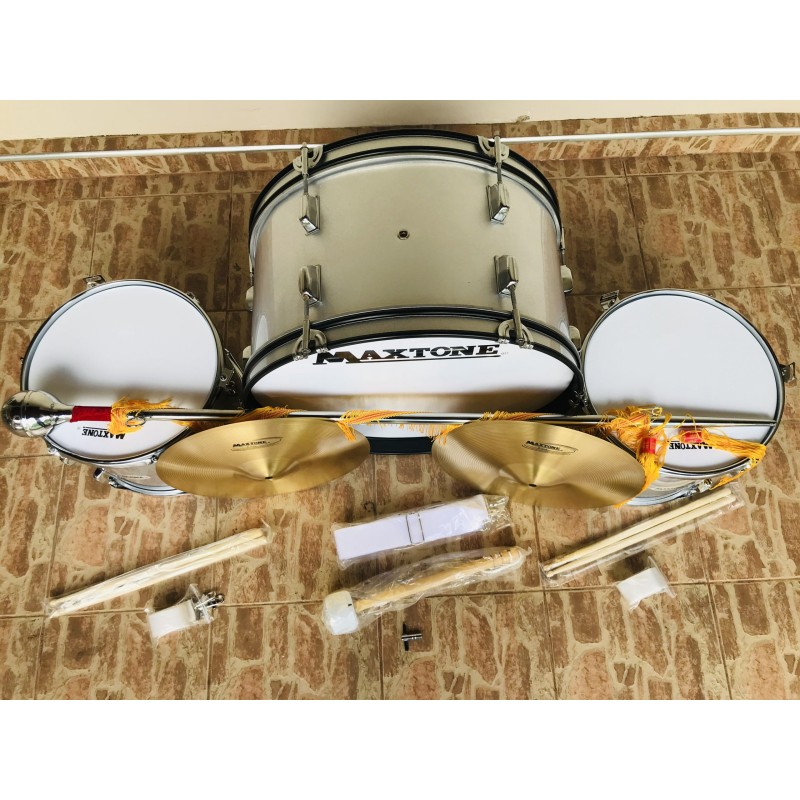 includes a 24'' bass drum, 2pcs 14'' side drums, a 14'' cymbal pair, and a 60'' leader mace