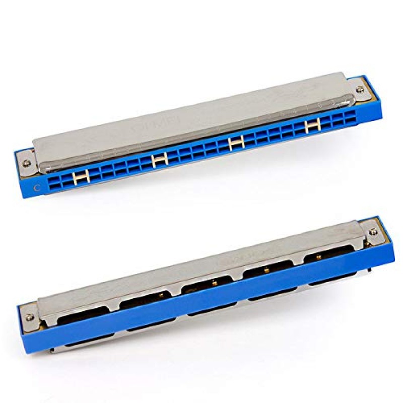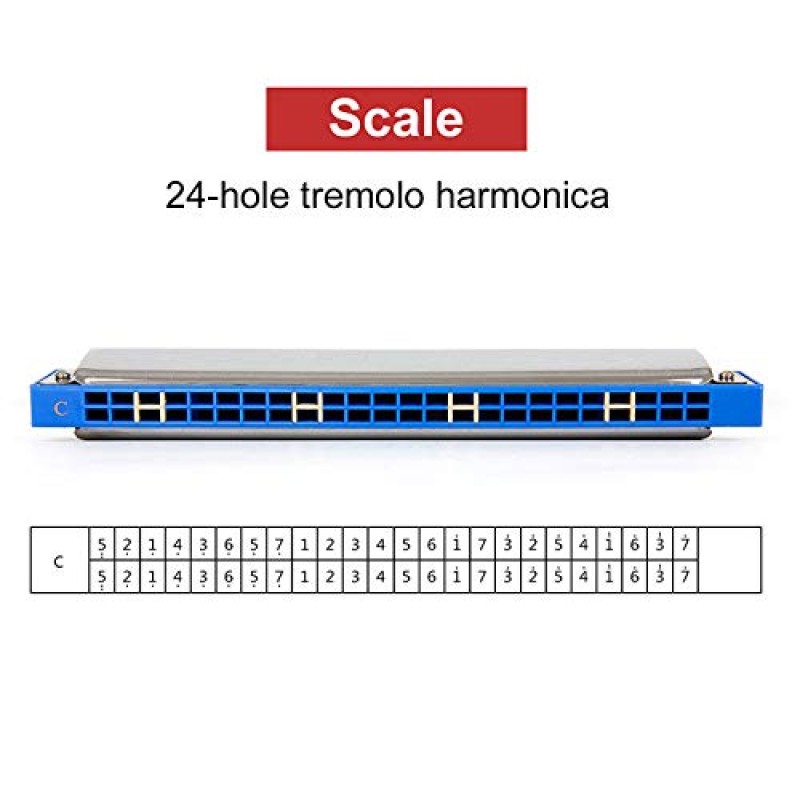 This is Qimei 24 Holes Octave Harmonica. Durable material, the Qimei 24 Holes Octave Harmonica is great for long time use. Also, you can make full use of it as you wish. Furthermore, you can take it as a gift to your friends or relatives. Features: - Tremolo harmonica with 24 holes and 48 reeds. - Exquisite and light-weight design allows you to enjoy a joyful time of music at any time and anywhere. - The cover is made of stainless steel, good durability. - Comes with a case and a piece of cloth, to keep your harmonica safe and clean. - Ideal for music lovers. 24 holes tremolo harmonica, the key of C, easy-to-play. Stainless steel cover plates, food grade resin fret. Good air tightness and excellent resonance performance. With marks of "Do", the ideal instrument for students and beginners. Comes with an exquisite box for convenient storage.