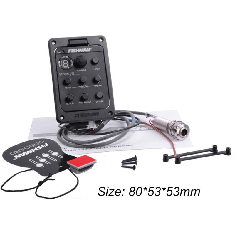 Features: 4-band equalizer, rotate bass/middle/treble to adjust volume frequency. With phase and tuner function. Tone and volume control. LED for battery check, replace battery when Batt lights. Built-in microphone with mic blend level control. Description: Unique pivot design for instant 9-Volt battery access. Powered by a 9V battery (not included). Best choice for music fans who love guitar. Specifications: Brand name: FISHMAN Model: Fishman 301 Color: black Size: 80*53*53mm Package Included: 1 x 4 Band EQ Equalizer 1 x End Pin Jack 4 x Mounting Screws 2 x Mounting Brackets 1 x User Manual (English) Notes: 1. Due to the difference between different monitors, the picture may not reflect the actual color of the item. We guarantee the style is the same as shown in the pictures. 2. Due to different personal measuring techniques, there might be 1-3cm error of the physical. Thank you!