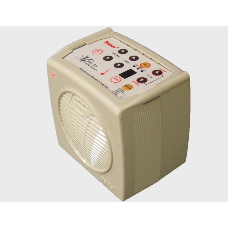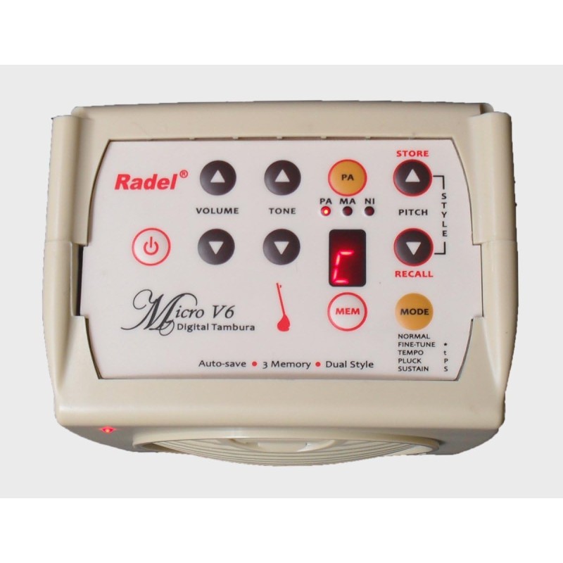 The new Saarang Micro V6 digital tambura (tanpura) is the ideal choice as an entry-level tambura for students, and very useful for teachers. It produces a realistic simulation of a 4-string tambura. It has several exciting features packed into a tiny palm sized attractive ABS cabinet: Digital volume and tone control through 'up' and 'down' buttons, similar to the buttons on a TV remote.
