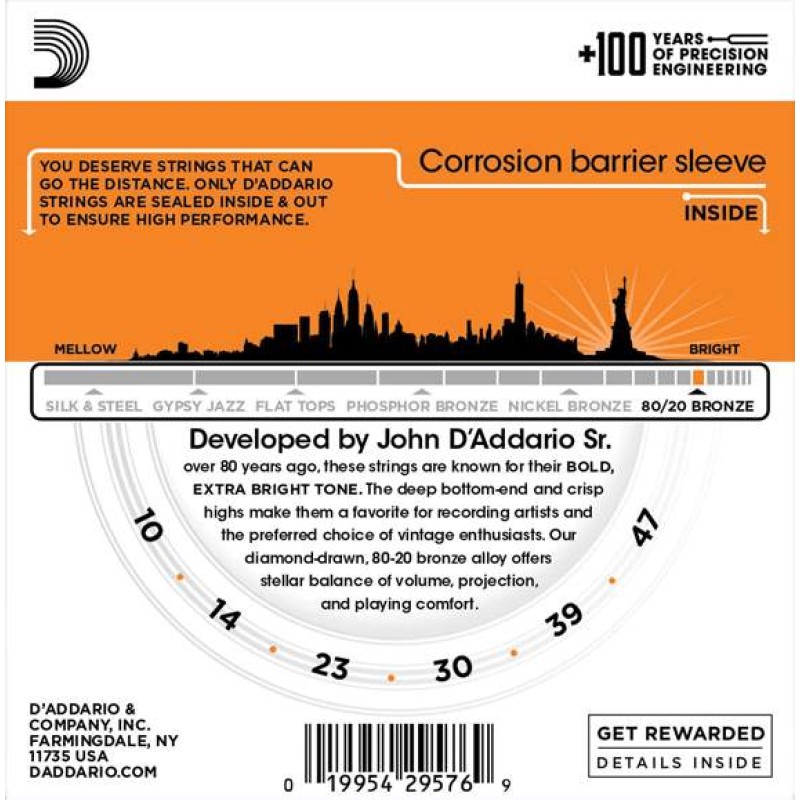 80/20 Bronze are our brightest acoustic strings, made to give your guitar an unparalleled shine. These bold sounding strings were developed by John D'Addario Sr. and guitar maker John D'Angelico in the 1930s, and have been beloved for their sparkling, trebly tone ever since. Made with a high carbon steel core and 80/20 Bronze wrap wire, 80/20 acoustic strings offer remarkable depth, along with rich, bright harmonics, and powerful projection. These 10-47 Extra Light gauge strings are easy to play and easy to bend.